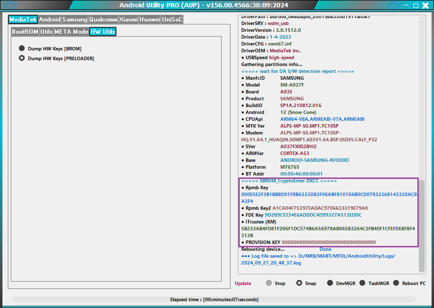 - Dump MTK Hardware keys from PRELOADER mode (RPMB, FDE, iTrustee/FBE(KM), Provision) keys.